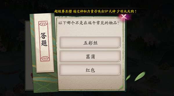 阴阳师哪个不是端午常见的物品答案是什么 重午节会端午答题分享,阴阳师哪个不是端午常见的物品答案很多玩家都在询问,最新的重午节答题活动,大家回答出正确答案就能领取奖励,下面为大家介绍阴阳师重午节会端午答题分享。阴阳师重午节会端午答题分享阴阳师哪个不是端午常见的物品答案分享:题目:以下...