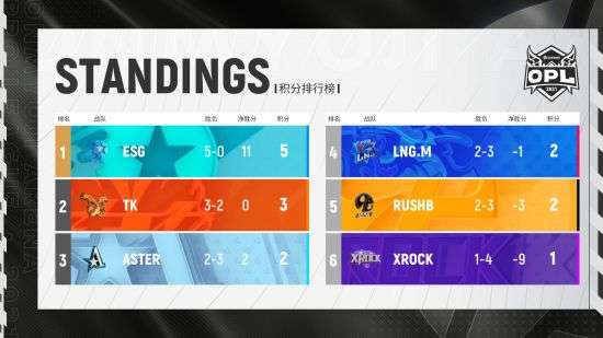 本周的比赛中,ESG以全胜的强者之姿晋级季后赛,TK先行一步击败ASTER晋级。而LNG.M,RUSHB,ASTER与XROCK在生死线上苦苦挣扎。最终,收官之战中,ASTER以3:0XROCK位春季赛的常规赛画上句号。 在ESG,TK,