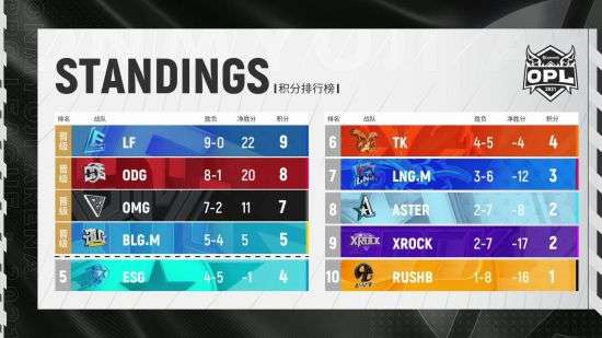 2021 OPL春季赛常规赛第一轮循环结束,排名靠前的4支队伍直接晋级季后赛,后6支队伍将在本周开始为了季后赛的名额继续展开战斗。 上周,除了备受期待的两只连胜队伍LF与ODG相遇在战场,LNG.M与XROCK,TK与BLG.M也打出来不