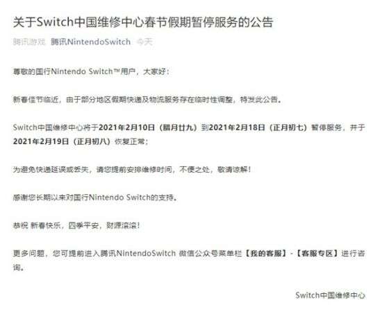 软件提交 专题合集 热门手游还有半个月就要迎来每年最重要的节日春节了,而春节很多商店公司都会选择停业一周,腾讯的NS维修中心同样如此,下面我们就来一起看一下吧。 腾讯NintendoSwitch今天发布关于Switch中国维修中心春节假期暂停服
