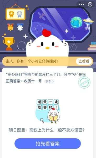 蚂蚁庄园寒冬腊月 蚂蚁庄园今日答案寒冬腊月答案,蚂蚁庄园寒冬腊月到底是哪个月,其中有三个月可以选择的,如何选择特别的月份呢,其中大家可以根据资料来分析出来,下面就来介绍下下蚂蚁庄园寒冬腊月是哪个月。“寒冬腊月”指春节前最冷的三个月,其中“冬”是指正确答案:农历十一月答...