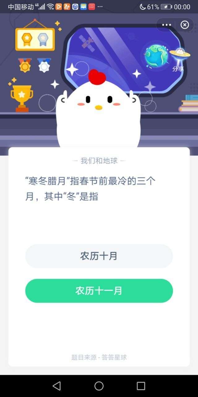 寒冬腊月的冬是指什么 蚂蚁庄园寒冬腊月的冬是指农历几月,蚂蚁庄园寒冬腊月是指哪个月,很多人不知道的,春节前最冷的三个月是哪几个月,大家知道吗,很多人都不清楚的呢,腊月是哪个月,下面就来介绍下腊月是哪几个月。寒冬腊月”指春节前最冷的三个月,其中“冬”是指农历十月农历十一月正确答...