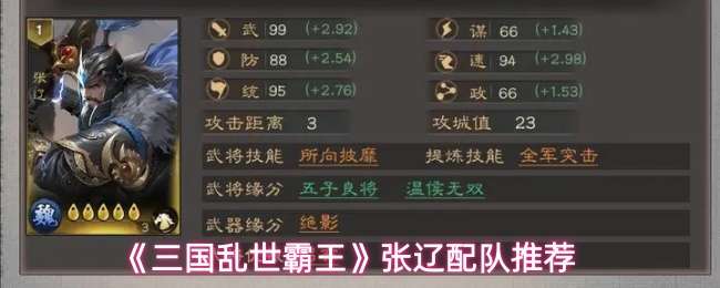 三国乱世霸王张辽怎么配队,张辽是魏阵营核心输出型武将,定位为大营主力输出,梯度属于T0级一线输出将。他的核心优势是:武属性(99)和速度(94)双高,是爆发型输出的代表之一。 《三国乱世霸王》张辽配队推荐: 推荐以张辽