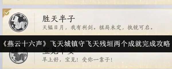燕云十六声飞天城镇守飞天残垣两个成就怎么完成?燕云十六声游戏中会有多种不同的玩法风格,如剑术、武技、甚至是太极等,可以混合搭配剑法、近身战等来战斗。那么飞天城镇守飞天残垣两个成就怎么完成呢?小编为你准备了一份攻略,一起来看看吧。