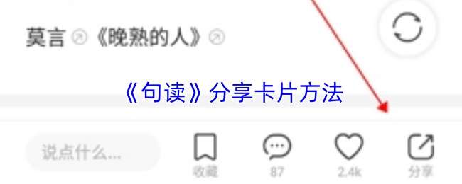 在句读首页或发现页找到想要分享的句子卡片,点击进入详情页后,点击右下角“分享”按钮,选择分享至微信、QQ、微博等社交平台,或直接复制链接分享给好友;部分版本支持生成精美图片卡片,点击“生成图片”后保存至相册,再通过相册分享至其他平台。