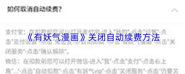 点击有妖气漫画app“我的”进入个人中心,再进入“帮助中心”,点击“关于vip”查看“取消vip自动续费”方法,按实际情况选支付宝、微信或话费解约;若用微信支付,打开微信,点击“我”-“服务”-“钱包”-“支付设置”-“自动续费”,找到有妖