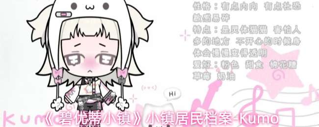 碧优蒂小镇居民Kumo档案一览,Kumo是一位从音符布丁穿越而来的幽灵咪化身,她总是戴着一顶猫耳帽,安静地抱着她的粉色贝斯。 她不太擅长在人群中说话,常常在排练前躲到后台偷偷深呼吸。 《 碧优蒂小镇》小镇居民档案-Kumo: