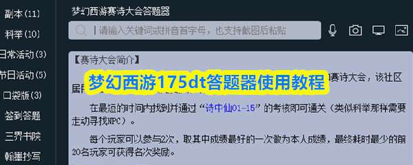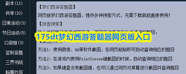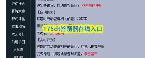 175dt梦幻西游答题器网页版入口为https://175dt.com/,可快速查询科举、灯谜等题目答案。使用时在左侧选择题目类型,右侧输入关键词即可自动匹配题库并显示正确答案,复制后到游戏内提交即可。 175dt梦幻西游答题器