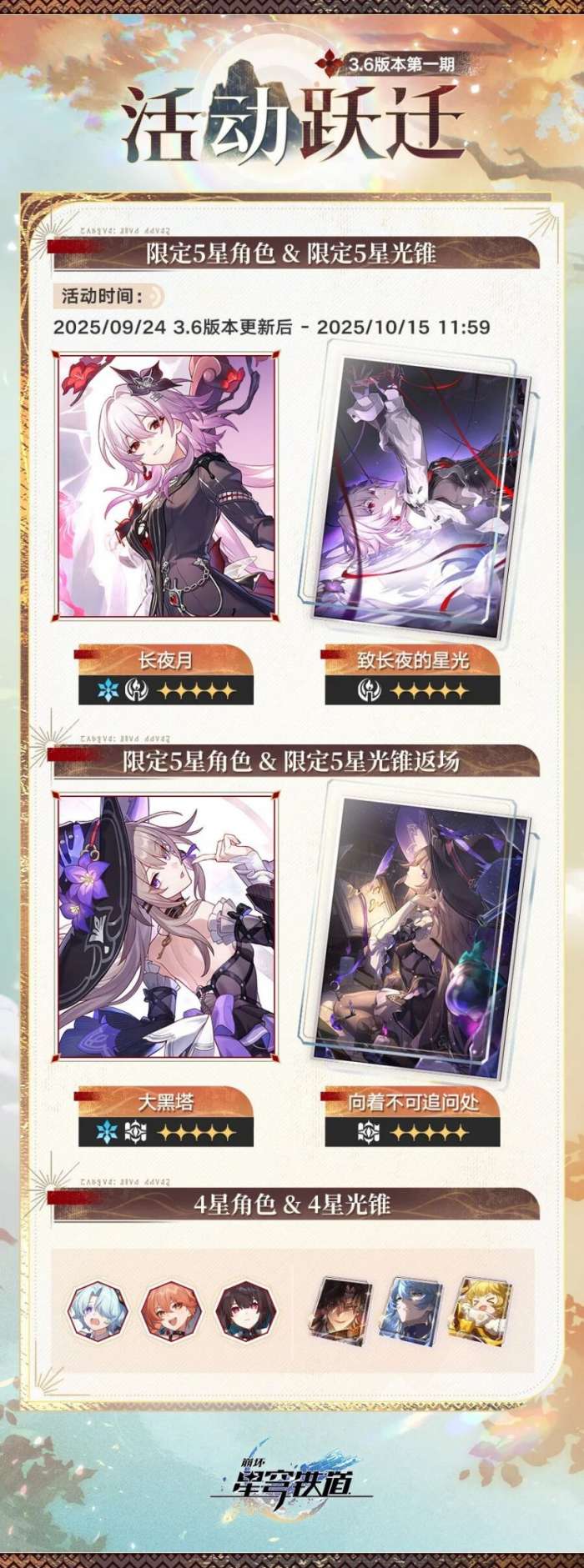 亲爱的开拓者: 本期活动跃迁时间为 2025/09/24 3.6版本更新后 - 2025/10/15 11:59。 限定5星角色「长夜月(记忆•冰)」「大黑塔(智识•冰)」,4星角色「米沙(毁灭•冰)」「桂乃芬(虚无•火)」「雪衣(毁灭•量子)」跃迁成功概率限时提升。 限定5星光