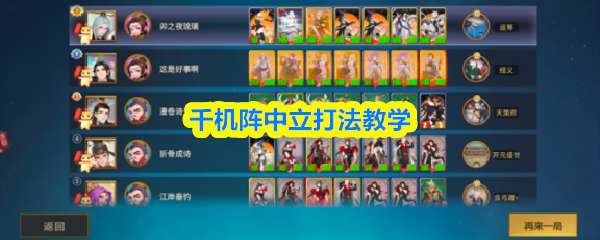 千机阵中立打法教学!中立阵容一般由:发育核心(麒麟,火鸟)战力胚子(王翦,霍去病,李白)经济核心(萧何,白虎,白泽,青龙)三个组成部分,由于中立阵容要不断上怪下怪,需要留一个空位,等到开战前可以上五本的中立毒药/三本的中立全场打2来增强战力
