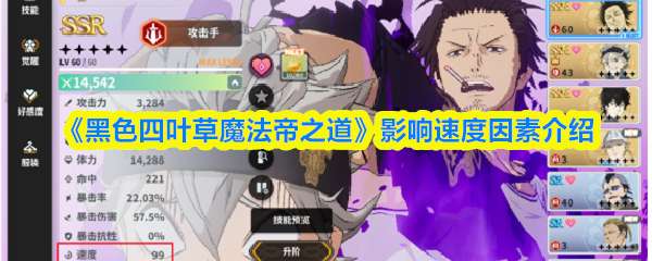 在《黑色四叶草魔法帝之道》中,速度值决定魔导士行动条充能顺序,速度越高,越早行动。该值会受增益、负面、被动及技能等多种效果影响,因此战斗需兼顾提升己方速度和降低敌方速度,以掌握先机。下面来看看《黑色四叶草魔法帝之道》影响速度因素详情吧!