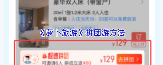在萝卜旅游进行拼团游,可打开APP后进入首页,在搜索栏输入想参与拼团游的目的地或相关关键词,找到心仪的拼团游线路后点击进入详情页,查看拼团人数、价格、行程等信息,确认合适后点击“立即拼团”或类似按钮,按提示完成支付等操作,即可成功参与拼团游