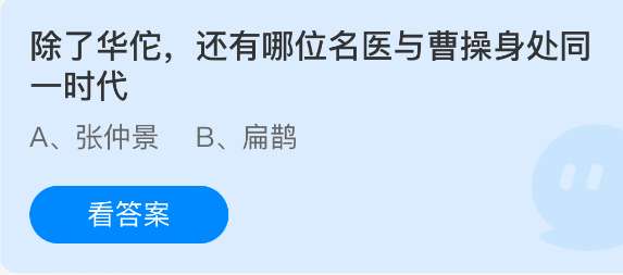 除了华佗,还有哪位名医与曹操身处同一时代?支付宝小鸡课堂开课啦!每天花一分钟答题赚饲料,喂喂小鸡就能贡献爱心啦!轻松又意义十足!2025年9月20日蚂蚁庄园的小鸡课堂题目正确答案是【张仲景】,曹操为东汉末年人物,与其同时期的名医除华佗外,还