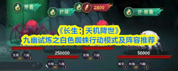 《长生:天机降世》九幽试炼第11轮遭遇强敌「白色蜘蛛」!该怪物拥有三组独特词条,技能交织、控制与爆发兼备,极具威胁。本文将详解其多阶段行动规律,并提供多套针对型阵容与实战技巧,助你精准拆解蛛网杀阵,顺利通关! 《长生:天机降世》