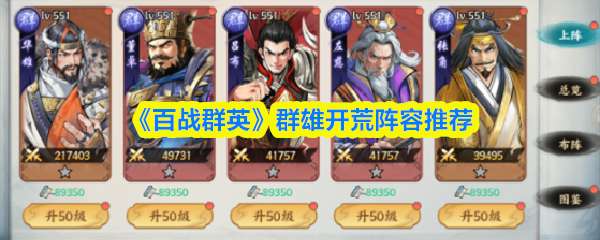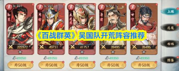 在《百战群英》中,吴国开荒阵容推荐使用太史慈、孙策、周瑜、鲁肃与甘宁。该阵容虽控制能力较弱,但其强大的持续输出不容小觑。尤其在“国战”玩法中,若攻打扬州,建议优先派出周瑜——其技能不仅具备五段高额伤害,还能通过“灼烧”效果削减对手气血上限,