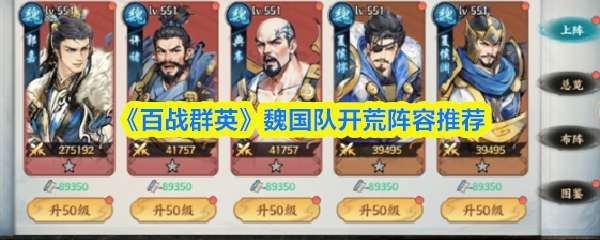 《百战群英》中共有四大阵营:魏、蜀、吴、群。在魏国开荒阵容中,推荐使用许褚、典韦、郭嘉、夏侯渊、夏侯惇。整套阵容层次清晰,兼具铺垫、触发、控制与输出,非常适合开荒使用。 《百战群英》魏国队开荒阵容推荐 [阵容推荐] 魏国