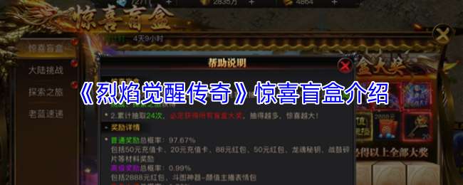 《烈焰觉醒传奇》游戏内的“惊喜盲盒”是一种趣味奖励玩法,玩家消耗特定道具或元宝即可开启,有机会随机获得从珍稀时装、高阶装备到大量绑元等丰厚奖励,其核心魅力在于以较低成本博取超值惊喜,是日常提升战力的热门途径之一。 《烈焰觉醒传奇