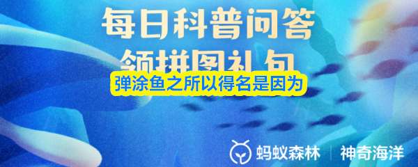 “弹涂鱼”之所以得名,是因为?支付宝蚂蚁森林神奇海洋2025年9月9日的新题目上新啦!快来答题解锁海洋新知识吧!今日正确答案是:【弹跳在滩涂上】。弹涂鱼俗称“跳跳鱼”,顾名思义,就是弹跳在滩涂上的鱼。 >>>>《支