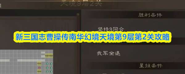 新三国志曹操传南华幻境天境第9层第2关主要难点在于理解,其实本关获胜条件是坚守3回合。而不是打。所以本关需要上一个弓箭手,我用的太史慈,夏侯渊也可以,下面是新三国志曹操传南华幻境天境第9层第2关攻略! 新三国志曹操传南华幻境天境