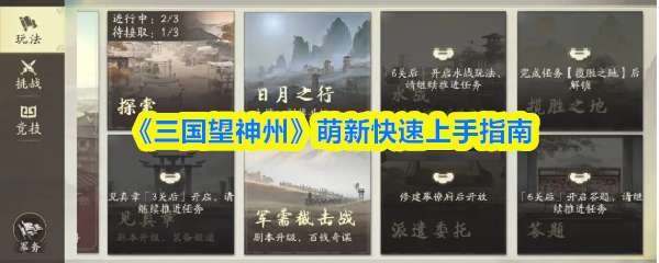 国画宣纸质感的场景,展祖国大好河山;工笔国漫风角色立绘,新派传统美;临场感十足的连环画剧情表演;诗词歌赋的书法之美,亦是三国。下面给大家带来了《三国望神州》萌新快速上手指南! 《三国望神州》萌新快速上手指南 优先提升主线剧
