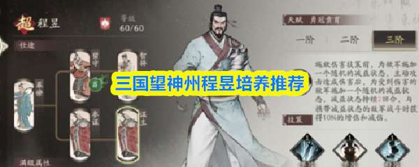 程昱的天赋被动很简单,就是攻击后为敌方附加随机的减益buff,如果用的是技能,那么在释放技能前还能附加一次debuff。并且对拥有debuff的敌人有增伤和减伤。下面给大家带来了三国望神州程昱培养推荐! 三国望神州程昱培养推荐
