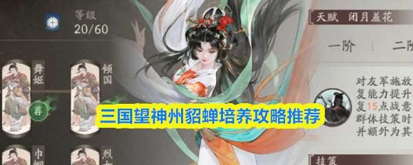 掬出芳心一片酸,温侯怒发欲冲冠。凤仪亭上佳人舌,抵作凌霜剑锷看。游戏中貂蝉的机制十分简单,即恢复怒气与血量。三阶后还可把敌方的怒气转到队友身上。下面给大家带来了三国望神州貂蝉培养攻略推荐! 程昱培养推荐 | 陈登培养推荐 | 简雍培养