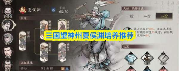 夏侯渊和其兄夏侯惇一样,在战旗基础的机制上一骑绝尘,极强的远程单体爆发和高移动,让他在很多需要满足击败条件和限制回合通关的关卡时成为首选。下面是三国望神州夏侯渊培养推荐! 三国望神州夏侯渊培养推荐 武将简介: 拉扯,拉扯