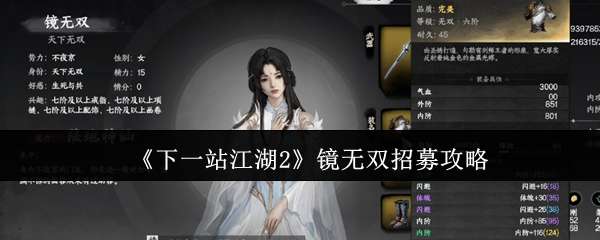 下一站江湖2镜无双怎么招募?有不少同学都想了解一下下一站江湖2镜无双怎么招募,小编今天就把详细的步骤给总结在文章中供各位同学参考。在下一站江湖2这款游戏中,镜无双是当前战力最强的一个角色,而很多小伙伴想把她招募进队伍,想知道这究竟能不能够成