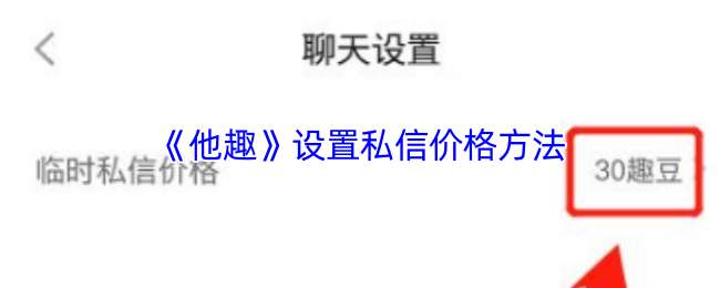 他趣设置私信价格时,可先打开他趣APP,用手机号登录账号后进入交友界面,接着点击页面右下角“我”,下拉页面找到“聊天设置”并进入,在页面上看到临时私信价格后点击,将免费0趣豆修改为想要的趣豆数量,如30趣豆,这样和对方聊天就收费了。