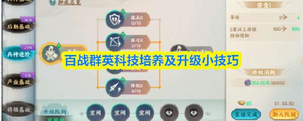 百战群英科技培养及升级小技巧来了,科技在前期无论是对战力属性还是资源生产来说都是可以起到关键性提升的作用,目前前期开放的科技有兵种基础、后勤基础、兵种进阶、产业基础、将领基础。(随着主公等级不断提升会开放更多科技)。 百战群英科