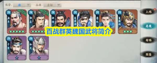 《百战群英》是一款以三国为背景的策略卡牌手游。玩家需选择魏、蜀、吴势力,通过经营封地、招募培养历史名将,并运用其独特技能,逐步扩张势力、提升战力,体验深度策略对决。下面是百战群英魏国武将简介。 >>>百战群英吴国武将简介