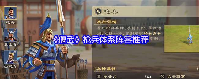 枪兵拥有较均衡的攻防属性,一方面能作为前排承担伤害,另一方面也有较不错的输出能力,在持续作战方面有较大优势。今天给大家带来《偃武》枪兵体系阵容推荐,小伙伴们可以做个参考。 >>>《偃武》骑兵体系阵容推荐 >>