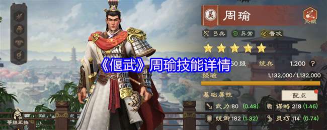 周瑜拥有1.46的谋略成长,可通过主动技打出高额谋略伤害,由于谋略值较高,其附加的灼烧状态也能打出更高伤害。除了输出以外,周瑜统御成长高达1.32,可以更好的维持兵力稳定,在持久作战下有额外优势。下面给大家带来了《偃武》周瑜技能详情! &