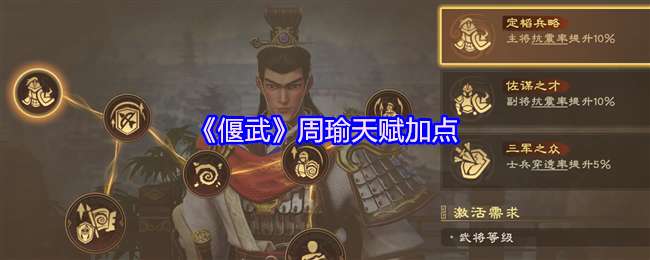偃武周瑜怎么加点?本篇给大家带来了偃武周瑜加点推荐路线:三军之众→双带两鞬→百变之阵→临机致胜→坚壁清野/镇定自若→出其不意→50级天赋。 >>《偃武》周瑜综合测评及配队推荐 《偃武》周瑜天赋加点 推荐路