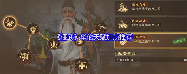 在偃武游戏中,华佗主动技可提供较大范围持续治疗,通过治疗伤兵可维持部队兵力稳定,对于开荒减损、持续作战有较积极的意义。下面是《偃武》华佗天赋加点推荐,不清楚如何加点的可以看看! 《偃武》华佗天赋加点推荐 天赋加点 推荐路
