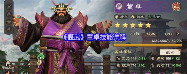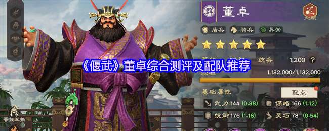 在《偃武》游戏中董卓拥有较高的谋略、统御成长,董卓可给队伍提供高额的异常增伤,与其他异常系核心搭配,可进一步提高输出。一方面可通过主动技、中毒状态附加来打伤害,另一方面有较高的生存能力,可维持队伍兵力持续打伤害。下面是《偃武》董卓技能详解!