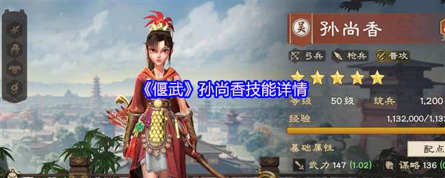 孙尚香巾帼英雄、蕙心纨质要提升至较高等级,才能发挥作用。在初期白板的情况下,如果有更好的选择,可以不用孙尚香。在觉醒后,两个核心被动提升到3级以后,孙尚香可得到较大提升,普攻流在持续作战的场合可优先选择孙尚香作为副将。下面给大家带来了《偃武