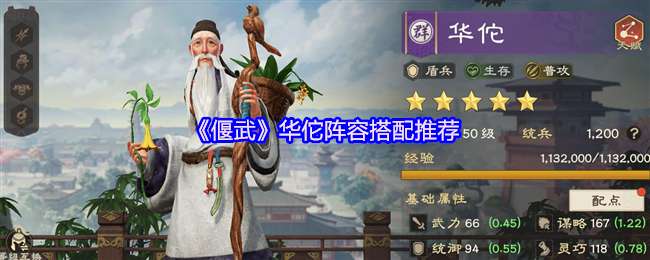 华佗主动技可提供较大范围持续治疗,通过治疗伤兵可维持部队兵力稳定,对于开荒减损、持续作战有较积极的意义。新手期如果想构建偏生存的队伍,可选择华佗作为过渡武将,紫卡更容易提升星级、觉醒。下面是《偃武》华佗阵容搭配推荐! 《偃武》华