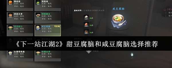 下一站江湖2甜豆腐脑和咸豆腐脑怎么选?自古以来甜咸之争就一直被南方朋友和北方朋友争论不休,这个问题也一直没有争论出最终的结果,就在大家不在继续争论的时候,在下一站江湖2中又出现了关于甜咸之争的玩法,对于下一站江湖2甜豆腐脑和咸豆腐脑到底选哪