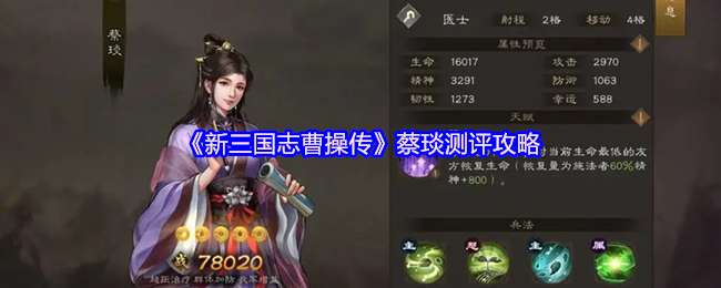 新三国志曹操传蔡琰这个武将是Wi-Fi奶妈,超距治疗,群体加防,我军增益。武将分级:T1级。下面是小编给大家带来的《新三国志曹操传》蔡琰测评攻略,感兴趣的小伙伴们一起来看看吧。 《新三国志曹操传》蔡琰测评攻略 蔡琰(普通)
