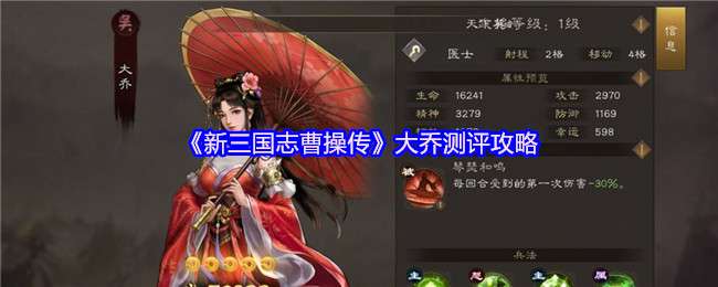 新三国志曹操传游戏中大乔这个武将可以造成减伤,受伤恢复,持续恢复。武将分级:T1级。下面是小编给大家带来的《新三国志曹操传》大乔测评攻略,感兴趣的小伙伴们一起来看看吧。 《新三国志曹操传》大乔测评攻略 大乔(普通) 兵种