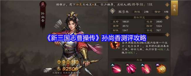 新三国志曹操传孙尚香是范围输出角色,焚烧结算,高命中。吴国纵火队成员之一。武将分级:T1级。下面是小编给大家带来的《新三国志曹操传》孙尚香测评攻略,感兴趣的小伙伴们一起来看看吧。 《新三国志曹操传》孙尚香测评攻略 孙尚香(