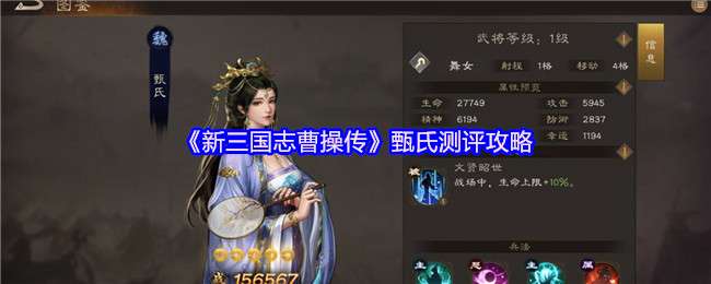 新三国志曹操传游戏中甄氏是非常不错的一个辅助MM,能加攻,能免疫,还有一手真实伤害的技能,目测比李儒的毒伤害还高,关键是长得非常有韵味,年少不知少妇好,错把少女当作宝。下面给大家带来了《新三国志曹操传》甄氏测评攻略! 《新三国志