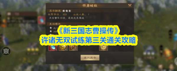 新三国志曹操传【许褚无双试炼第一关·保卫家乡】本攻略为更新前打法(可上阵神兽)。强制上阵许褚,首回合对左侧百姓使用技能,次回合目标如图,第三回合释放大招。结束敌军回合后即可顺利过关。 >>>《新三国志曹操传》许诸无双试练