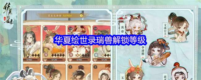 华夏绘世录瑞兽解锁等级为20级。而且瑞兽也是通过抽卡来解锁和升星的。名士要抽卡,文物要抽卡,瑞兽也要抽卡。集够了碎片就可以激活相应的瑞兽。 华夏绘世录瑞兽解锁等级 20级可解锁瑞兽。 1.瑞兽需要靠瑞兽拜贴来抽取碎片,集