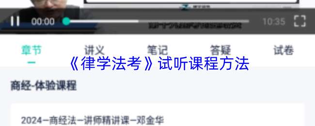 进入律学法考APP,找到“体验课程”板块,可按科目或讲师等对课程进行筛选,找到想要听的课程后点击“立即试听”,即可开始听课,不过需注意试听不支持讲义、笔记、答疑、试卷功能。试听结束后可根据课程质量决定是否购买完整课程,助力高效筛选备考资源。