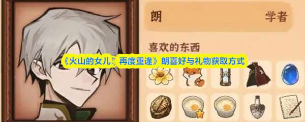 《火山的女儿:再度重逢》中,朗喜爱金色兰花、小狐狸等。关键礼物包括奶油焗蛋(烹饪)、蓝色的宝石蛋(冰霜峡谷事件)、史前的化石(冥滩事件)及鬼蘑菇药剂(秋火年炼金),均可有效提升其好感。 《火山的女儿:再度重逢》朗喜好与礼物获取方