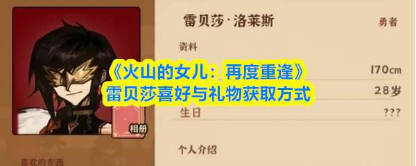 《火山的女儿:再度重逢》中,雷贝莎喜爱茉莉、野猪等。关键礼物包括热葡萄酒(烹饪)、蓝色的宝石蛋(冰霜峡谷事件)、奴隶的脚链(烈焰河事件)及战争药水(秋火年炼金),均可有效提升其好感。 《火山的女儿:再度重逢》雷贝莎喜好与礼物获取