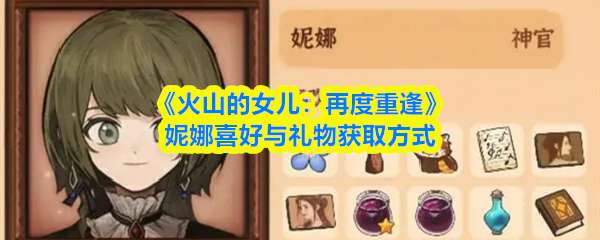 《火山的女儿:再度重逢》中,妮娜喜爱勿忘我、小熊猫等。关键礼物包括葡萄果酱(烹饪)、莫娜肖像(野马湖绘制)、《占卜的起源》(故事角)及吐真剂(秋火年炼金),均可有效提升其好感。 《火山的女儿:再度重逢》妮娜喜好与礼物获取方式