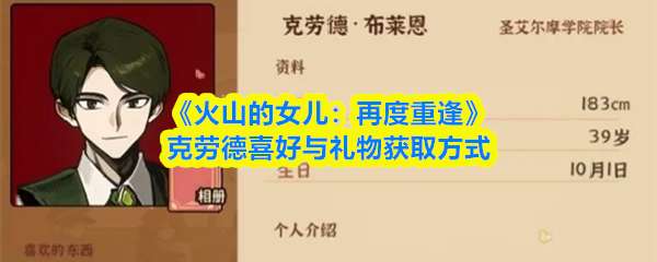 《火山的女儿:再度重逢》中,克劳德喜爱红玫瑰、山羊等。关键礼物包括野莓烧肉(烹饪)、海德斯之镜(秋火年炼金)、《论绅士风度与自由学科》(冬火年读书)及史前的化石(冥滩事件),均可有效提升其好感。 《火山的女儿:再度重逢》克劳德喜